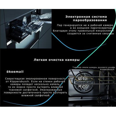 Компактный духовой шкаф с паром Kuppersbusch CBD 6550.0 Объем: 43 литра TFT-дисплей шириной 3,9" с текстовым и графическим полями 14 режимов духового шкафа 8 специальных режимов 6 режимов приготовления на пару 9 специальных режимов приготовления на пару Более 40 автоматических программ 20 избранных программ для сохранения индивидуальных настроек Электронная система управления с сенсорными кнопками Отображение фактической температуры и рекомендуемой Электронный таймер (продолжительность программы, окончание, таймер обратного отсчета) с белыми индикаторами Съемная дверца с полностью стеклянной внутренней поверхностью Четырехслойное остекление дверцы Быстрый разогрев Экономичный режим Демо-режим Режим ожидания Галогенная подсветка Контактный дверной выключатель Катализатор Okoterm очищает воздух во время приготовления, таким образом стенки духового шкафа всегда абсолютно чистые! В отличие от энергоёмкой технологии пиролиза (разрушение частиц грязи путём дожигания) при температуре около 500°С, okotherm® не требует дополнительного времени и дополнительных затрат электроэнергии. Режимы работы Верхний и нижний нагрев Подача тепла сверху и снизу обеспечивает равномерное приготовление продуктов, расположенных на одном уровне. Прекрасно подходит для выпечки пирожных и пирогов, например, изделий из дрожжевого теста, чизкейков и т. д. Обдув горячим воздухом с Okotherm Вентилятор распределяет тепло, генерируемое кольцевым нагревательным элементом, который расположен на задней стенке рабочей камеры. Обеспечиваемая таким образом одинаковая температура по всему объему рабочей камеры гарантирует равномерное приготовление блюд на всех уровнях направляющих, не ухудшая их вкус и запах Верхний и нижний нагрев с обдувом горячим воздухом Тепло, генерируемое верхним и нижним нагревательными элементами, равномерно распределяется по объему рабочей камеры с помощью вентилятора. Прекрасно подходит для выпечки и жарения Режим "пицца" с Okotherm Сочетание нижнего нагрева и обдува горячим воздухом оптимально подходит для приготовления изделий в виде хрустящей основы с мягкой начинкой. Идеально для пиццы, печенья или выпечки с начинкой из фруктов и паштетов Нижний нагрев Благодаря теплу, генерируемому только нижним нагревательным элементом, данный режим прекрасно подходит для приготовления изделий с хрустящей основой или для получения более коричневой корочки снизу. Прекрасно подходит для приготовления очень мягких фруктовых пирогов и для легкого запекания тестовой основы пирогов перед приготовлением Верхний нагрев Тепло, генерируемое верхним нагревательным элементом, прекрасно подходит для запекания и подрумянивания блюд ECO Режим ECO позволяет уменьшить энергопотребление при приготовлении блюд. Для снижения потребления электроэнергии, духовой шкаф автоматически отключается за несколько минут до окончания приготовления блюда, используя тепло, остающееся в рабочей камере, для доведения блюда до готовности Интенсивный обдув горячим воздухом с Okotherm Включенный верхний нагревательный элемент, помимо обдува горячим воздухом, используется для создания хрустящей корочки и подрумянивания блюда. Прекрасно подходит для приготовления запеченного картофеля, жарения или запекания Гриль + нижний нагрев Тепло от нижнего нагревательного элемента и распол